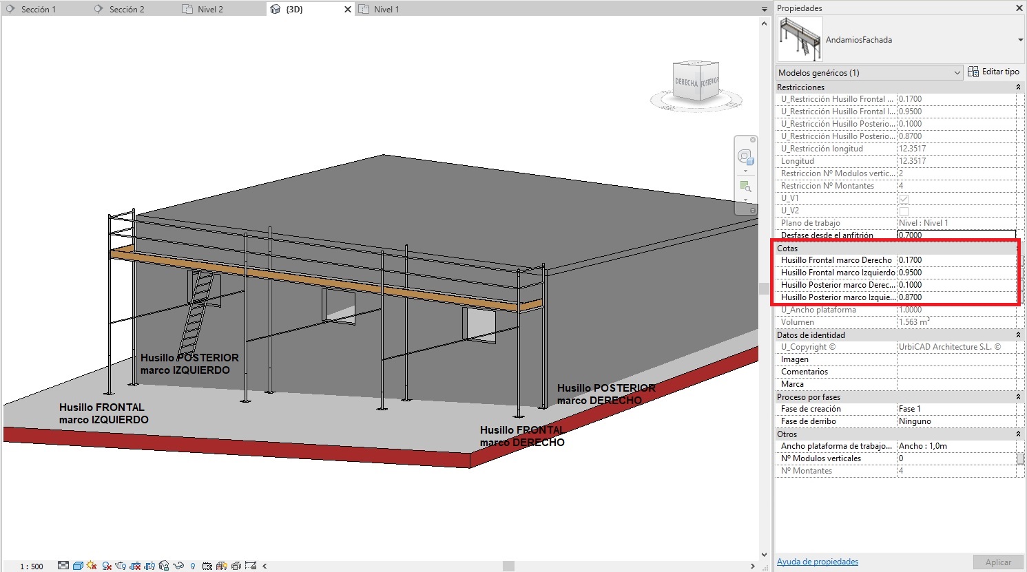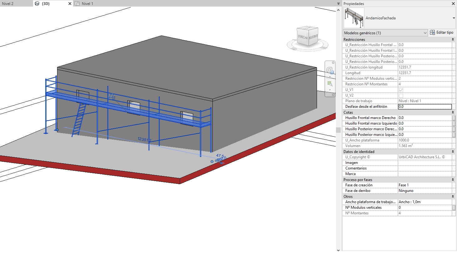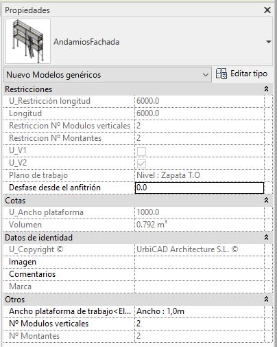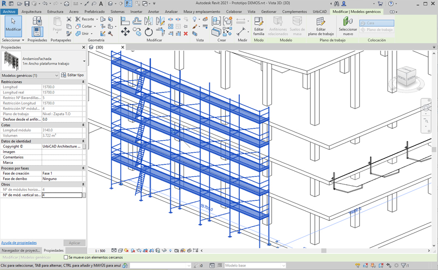 Una vez colocado el andamiaje, si desea modificar cualquier valor, por ejemplo, el número de módulos verticales u horizontales, simplemente deberá seleccionar el andamio y desde Propiedades modificar dicho valor.
