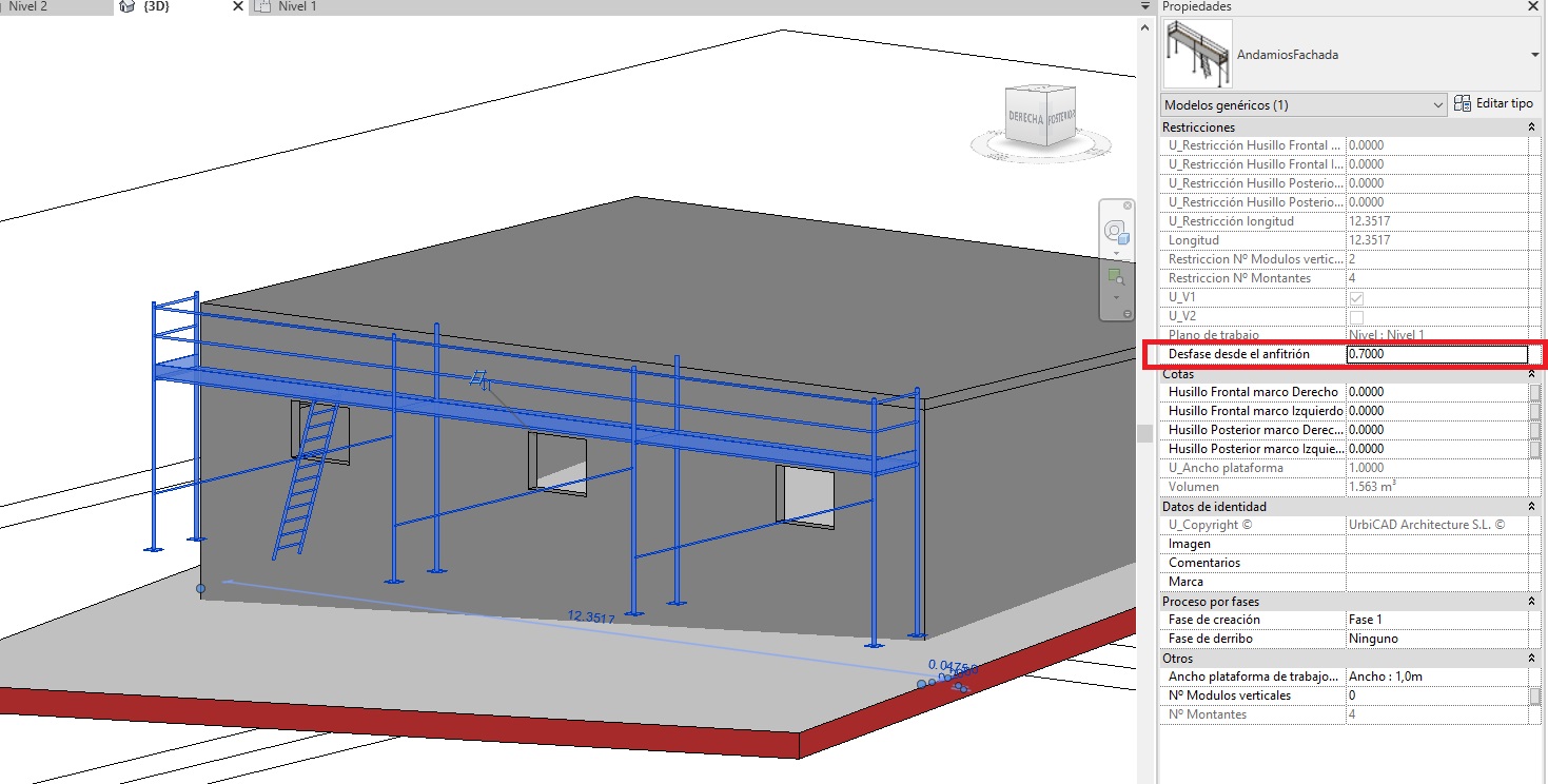 Deberemos introducir el Desfase desde el anfitrión en las Propiedades del Andamio para que nos quede más o menos así como se observa en la imagen: