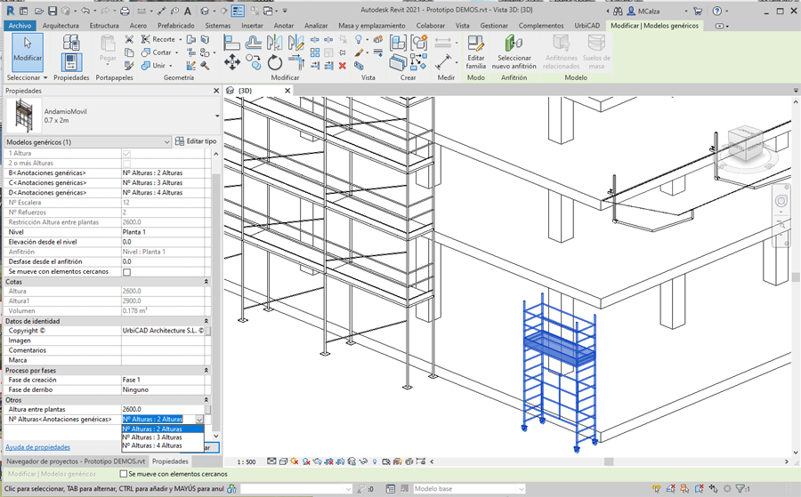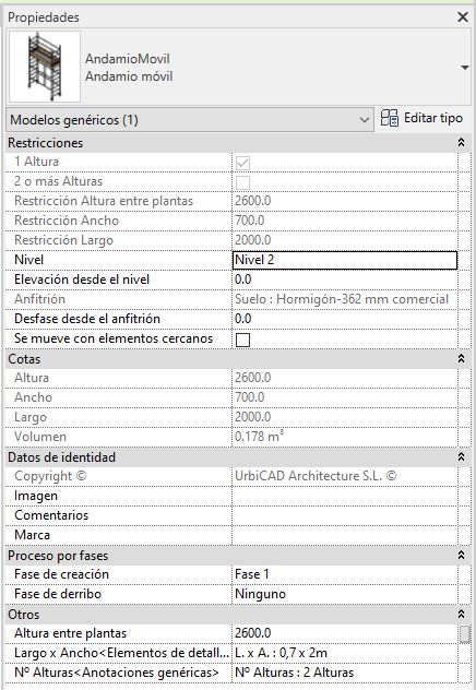 Una vez colocado el andamio móvil, es posible como siempre y desde propiedades, ajustar los parámetros del mismo.