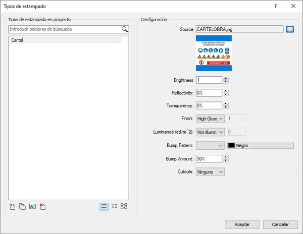 Desde el cuadro de diálogo de tipos de estampado, cree un nuevo estampado, por ejemplo: Cartel y a continuación cargue la imagen JPG que le proporcionamos desde UrbiCAD (CartelObra.jpg) o la que ya tenga.