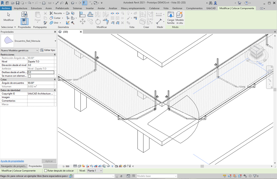 3. Asigne los parámetros del cuadro de Propiedades e inserte la red marcando el punto superior de la esquina del canto del forjado, tal como observa en la imagen inferior.