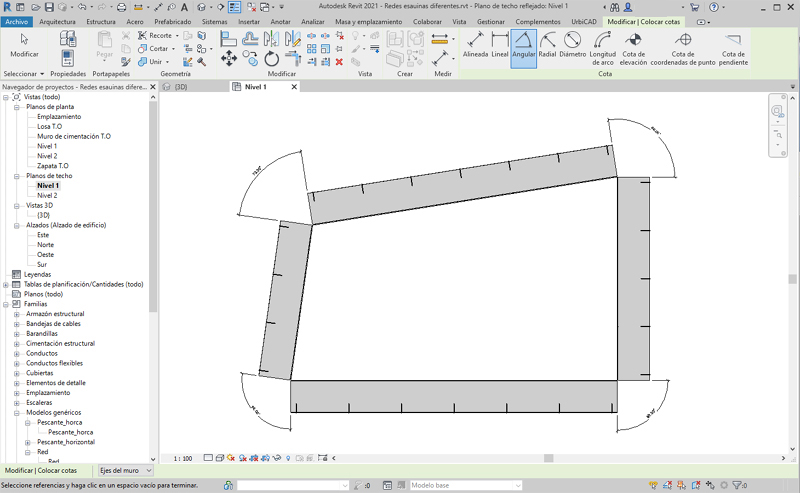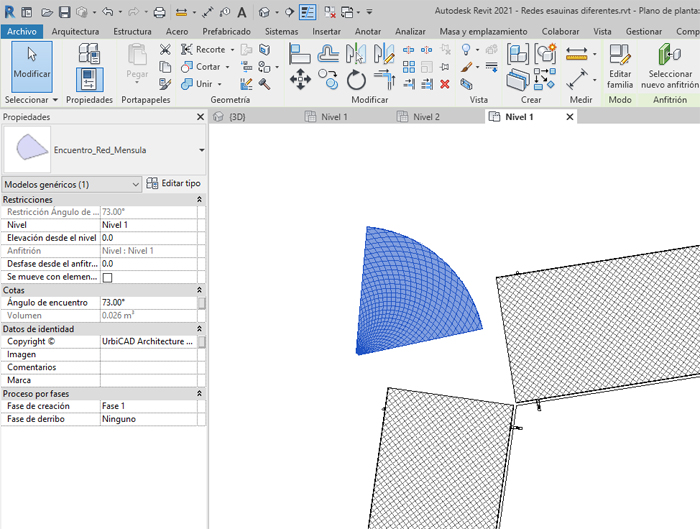 Cada módulo se selecciona y desde Propiedades le ponemos un ángulo tal que la suma de los dos de como valor el ángulo del encuentro que en este caso de la imágenes de 98º.