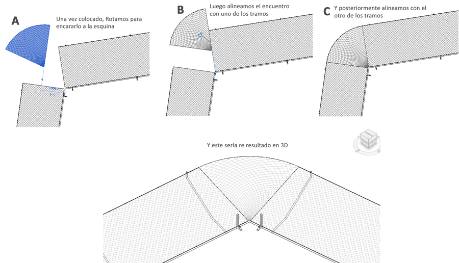 La verdad es que le resultará mucho más cómodo colocar la red en vista planta que en 3D, tal como observa. Por lo tanto le aconsejamos que utilice la vista planta para la colocación de los encuentros de esquina: