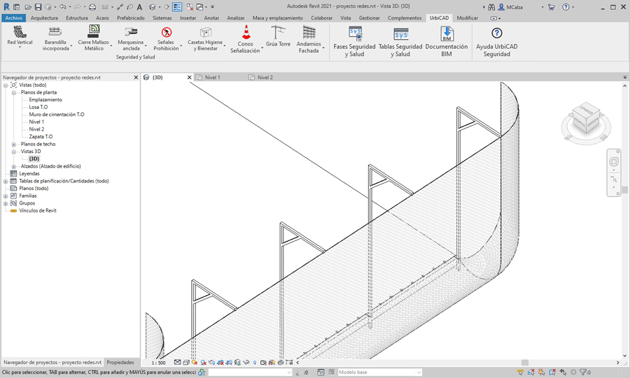 2. Coloque preferentemente primero los tramos rectos de la red, tal como observa en la imagen siguiente, y posteriormente vaya a la cinta de opciones de UrbiCAD y seleccione: Red vertical, colocando la red en las esquinas, tal como observa en la imagen inferior y sin entrar mucho en detalle de aproximarla más o menos a la esquina del encuentro.