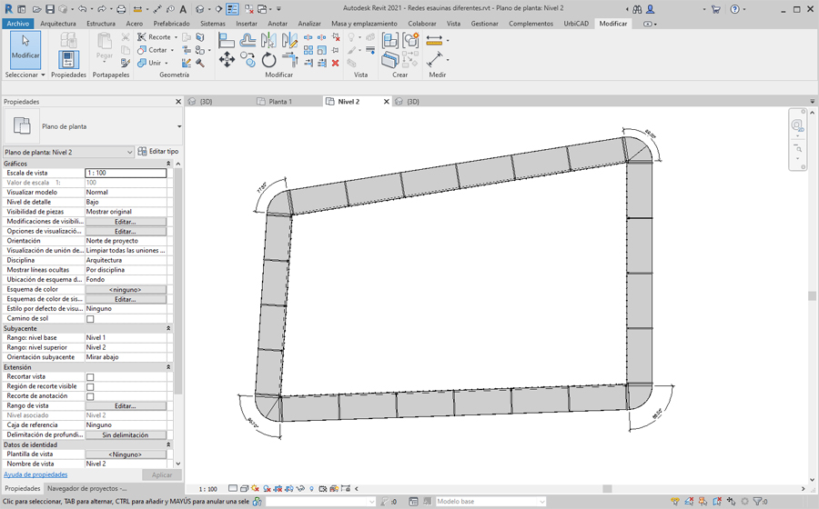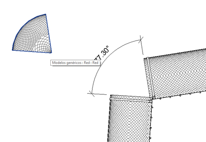 Como los módulos se ajustan como máximo desde Propiedades a un valor entre 10º y 90º, si hemos de cubrir ángulos mayores a 90º hemos de insertar al menos dos módulos como observamos en la imagen anterior.