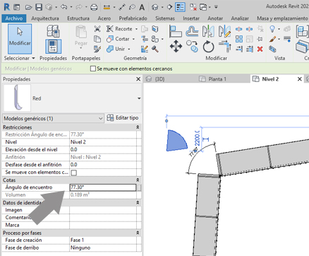 Primero seleccione el módulo y asigne desde Propiedades el ángulo del encuentro, tal como observa en la imagen: