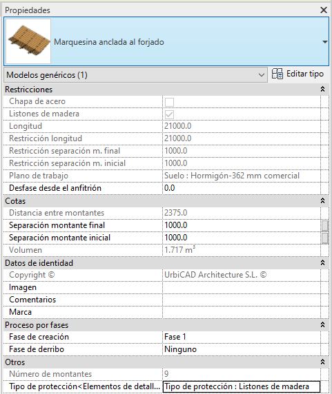 3. Seleccionamos desde Propiedades, los nuevos valores de la nueva marquesina a cambiar, y ejecutamos la acción.