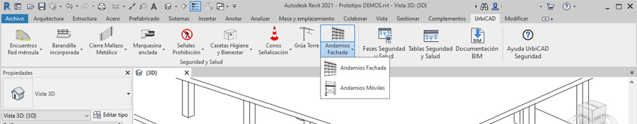 Para ello deberá acceder desde la barra de herramientas de UrbiCAD, tal como observa en la imagen anterior y seleccionar el medio auxiliar (andamio de fachada o andamio móvil) a colocar deseado.