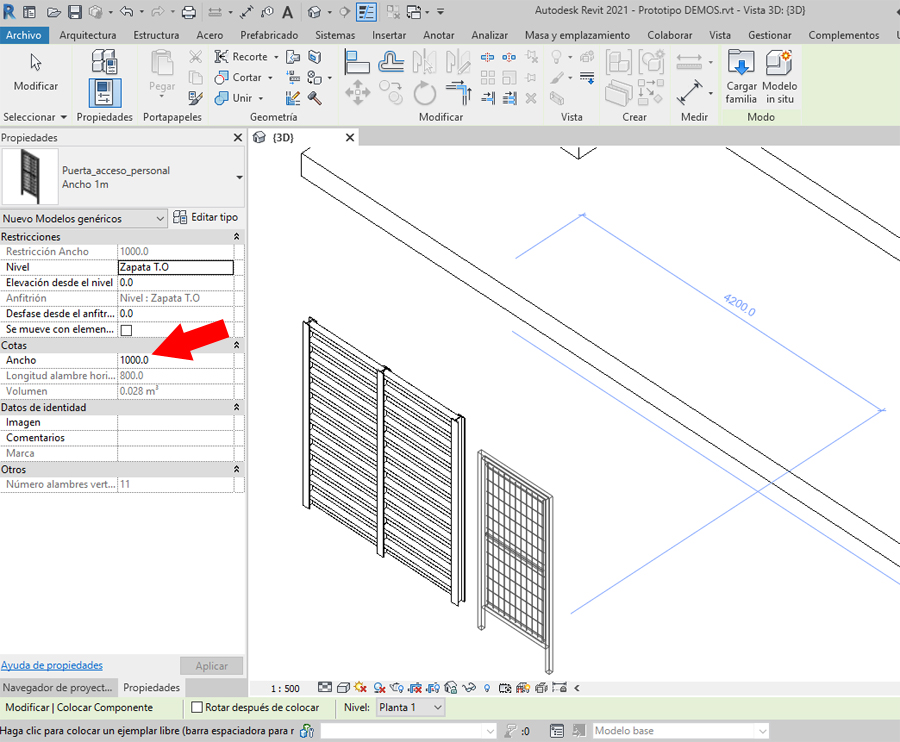 3. Asigne el parámetro de ancho desde el cuadro de Propiedades e inserte la puerta, tal como observa en la imagen inferior.