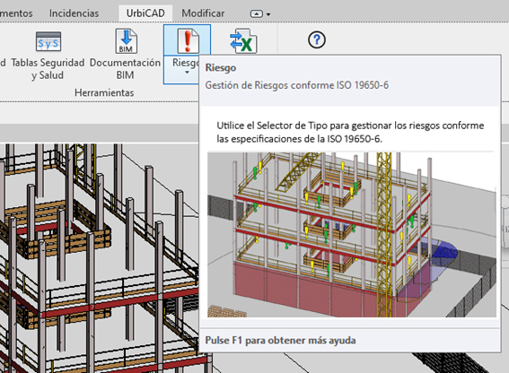 Dentro del grupo Herramientas, el botón de Riesgo permite dar cumplimiento a la norma ISO 19650-6 basada en la PAS 1192-6, contando con 36 riesgos tipificados que integran a su vez parámetros requeridos por la norma.