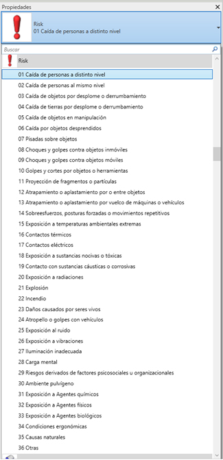 - Seleccione desde Propiedades el tipo, es decir, uno de los 36 Riesgos tipificados, como se muestra en la siguiente imagen: