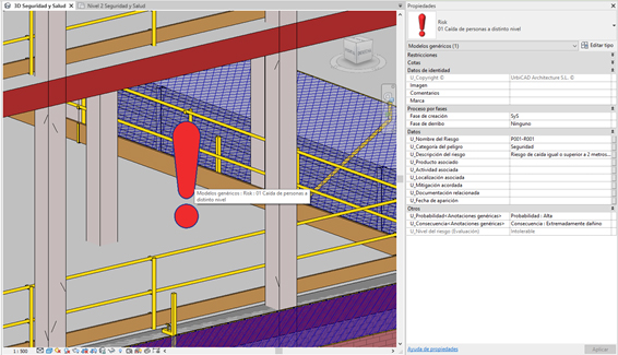4. Una vez seleccionado el riesgo desde tipos, elegida la vista y fase adecuadas, ya puede colocar el componente Risk donde desee marcar el tipo de riesgo seleccionado; asígnele un nombre distintivo y único para el proyecto actual antes de insertarlo, o bien, una vez insertado seleccione el riesgo y añádalo en Nombre del Riesgo, cómo se ve en la siguiente imagen.