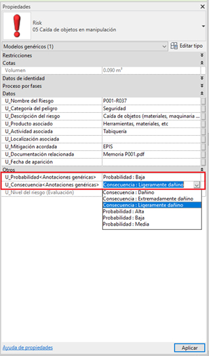 2. Desde Propiedades > Otros y elegimos la Consecuencia y Probabilidad que deseemos. Posteriormente Aplicamos cambios (abajo a la derecha). Ver la siguiente imagen: