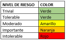 La familia de Riesgos tiene un código de colores que permite identificar visualmente el Nivel/Evaluación del riesgo, este código de colores es el adoptado por el INSST, ya que es muy intuitiva su comprensión:
