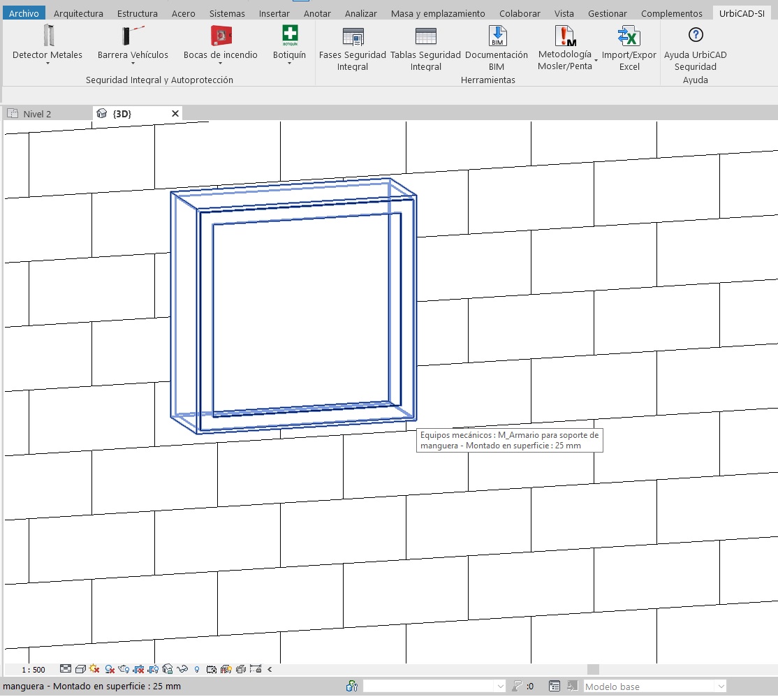 - Haga Click en cualquier punto del modelo para insertar la familia. Estas familias se colocarán sobre un muro/pared, se muestra el ejemplo de M_Armario para soporte de manguera.rfa: