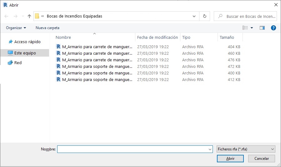 Se mostrará un listado de familias de Bocas de Incendio, elija la que quiera insertar en el proyecto y haga click en Abrir. Haremos el ejemplo con M_Armario para soporte de manguera.rfa: