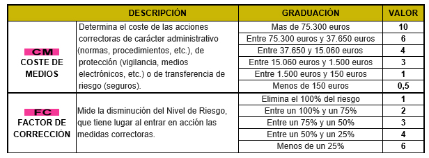 Esta fase tiene por objeto ayudarnos a tomar una decisión sobre la optimización de los medios empleados. Teniendo en cuenta el coste (Coste de los Medios) y el grado de corrección del riesgo (Factor de Corrección).
