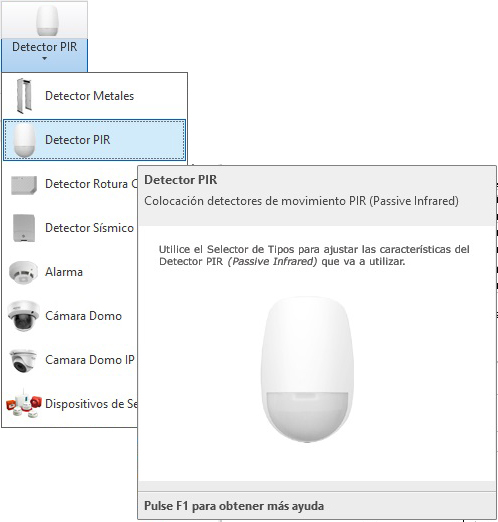 Seleccione desde el selector de tipos, este Detector PIR, tal como observa en la imagen: