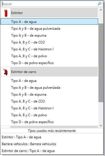 Seleccione desde el selector de tipos, este Extintor, tal como observa en la imagen: