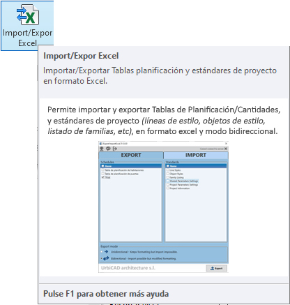 Una vez seleccionada esta opción (y evidentemente si tiene alguna tabla creada en su modelo BIM, tanto de mediciones de Seguridad Integral y Autoprotección, Señalización como de Riesgos), observará que se abre el cuadro de Importación/Exportación que se observa en la imagen inferior: