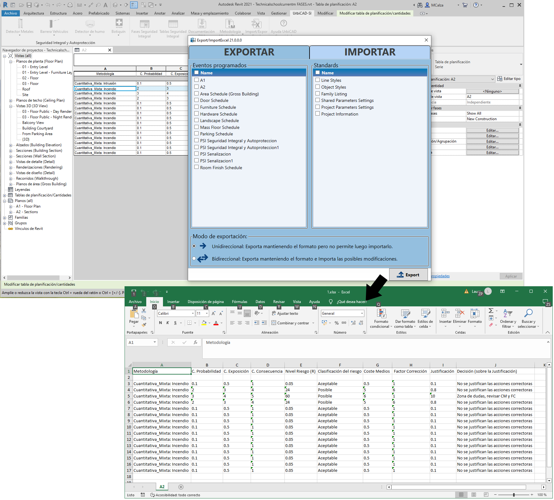 Bidireccional: Normalmente esta debería ser la forma y el modo de trabajo cuando quiera obtener sus tablas en formato EXCEL. De este modo, cualquier variación o modificación que haga desde excel (por ejemplo una modificación en la evaluación de algún riesgo), será trasladada directamente a su modelo BIM, con lo cual la información es Bidireccional (entrada-salida al modelo BIM).