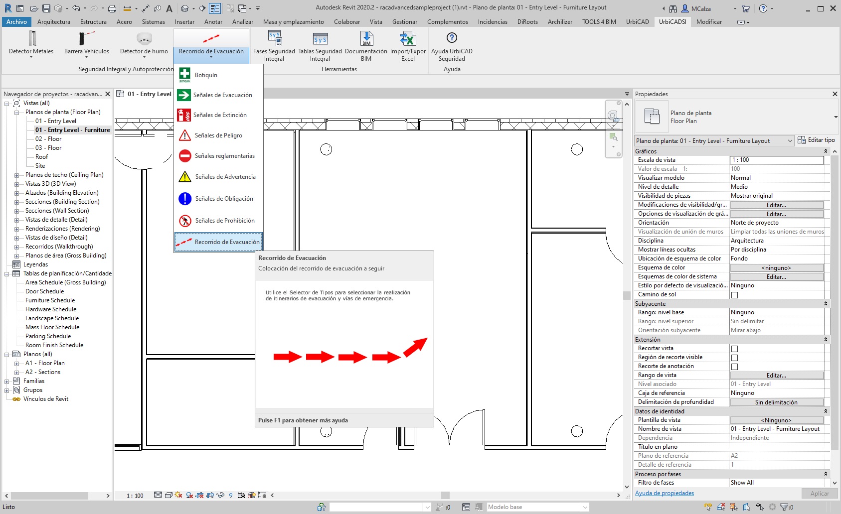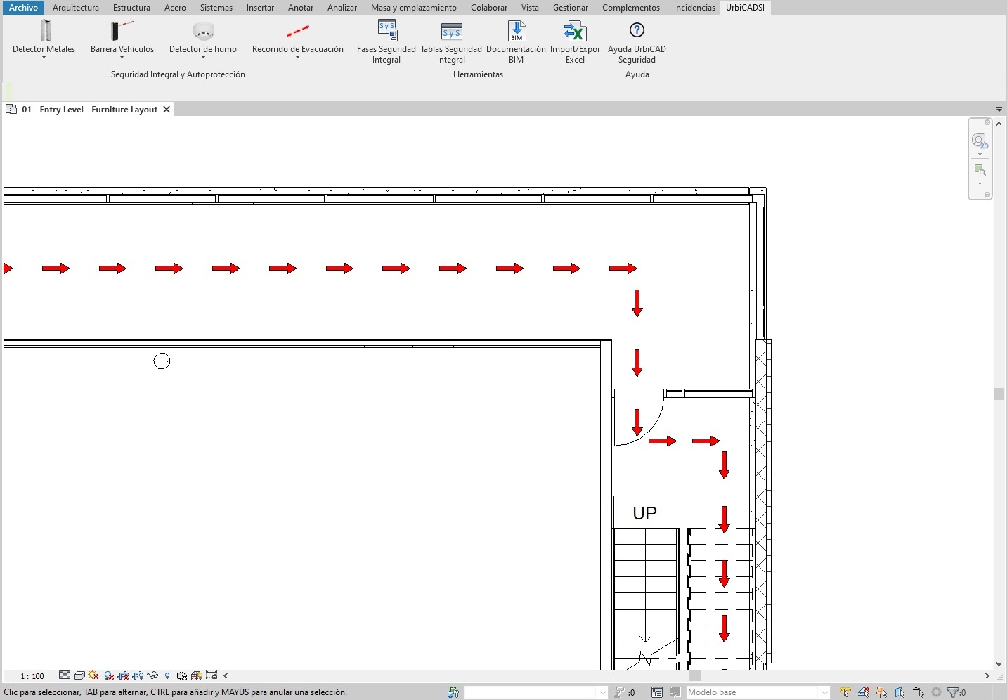 - En el menú de UrbiCAD Seguridad Integral y Autoprotección, haga click en Recorrido evacuación (ver imagen anterior).