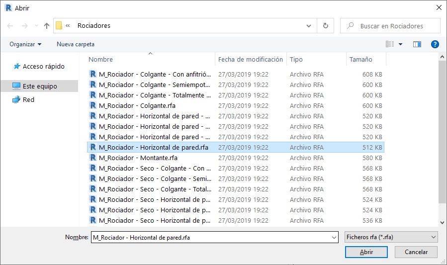 Se mostrará un listado de familias de Rociadores, elija la que quiera insertar en el proyecto y haga click en Abrir. Haremos el ejemplo con M_Rociador - Horizontal de pared.rfa: