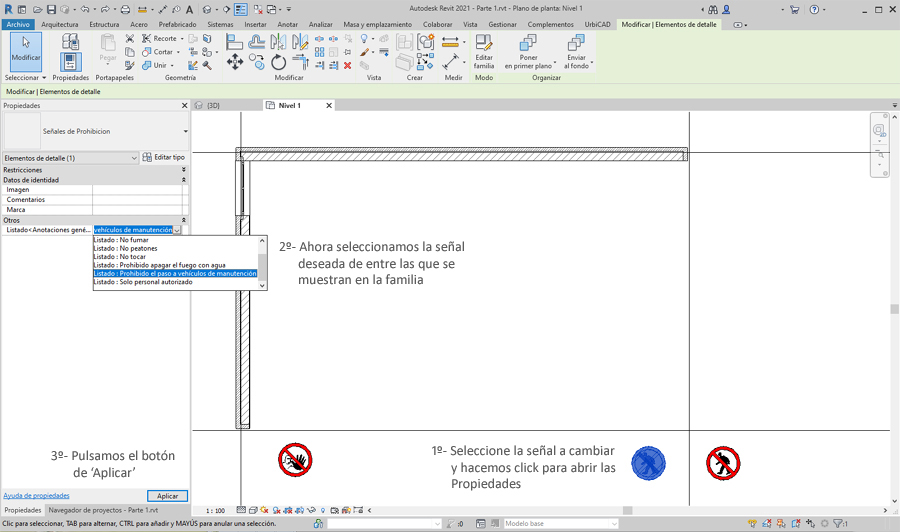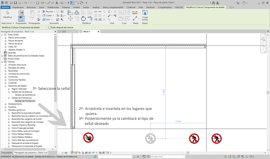 2. Una vez seleccionado el tipo desde el selector de tipos, se cargará. Ahora vaya al Navegador de Proyectos, y desde Familias--->Elementos de detalle ya podemos verla y seleccionar la señal e insertarla en el punto o puntos deseados.