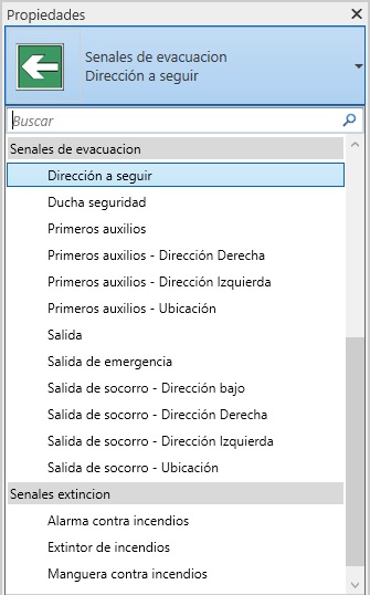 Una vez insertada la señal, no se podrá cambiar de tipo, debe ser antes de colocarse cuando se elija el tipo adecuado a colocar. Para ello deberá seguir las especificaciones que se observan en la siguiente imagen, donde verá que desde Propiedades y en el desplegable de Tipos, podrá seleccionar los diferentes tipos que ofrezca la señal, por ejemplo, en señales de evacuación tenemos: