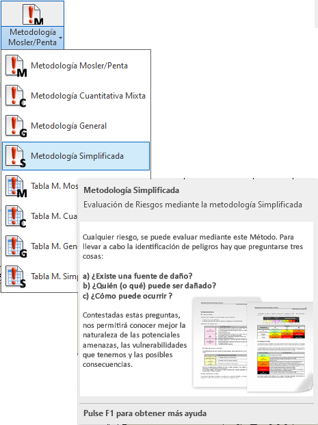 1º- Seleccionamos desde la cinta de opciones, la Metodología a aplicar. En este caso la metodología Simplificada y elegiremos uno de los tipos predefinidos (Accidentes Laborales, Actos Vandálicos, Incendio, Intrusión, Medioambientales o Sabotaje Informático/Fuga de Información) desde el apartado de propiedades, como se muestra en las siguientes imágenes: