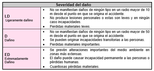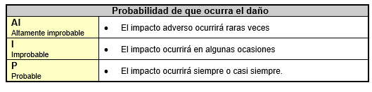 La probabilidad de que ocurra el daño se puede graduar, desde baja hasta alta, con el siguiente criterio: