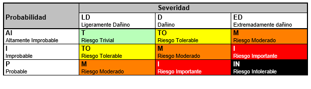 La estimación del riesgo se realiza en función de la severidad del daño y de la probabilidad asignada en cada caso, de acuerdo con los criterios de la siguiente matriz: