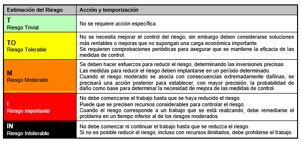 En la siguiente tabla se muestra un criterio sugerido como punto de partida para la toma de decisión. La tabla también indica que los esfuerzos precisos para el control de los riesgos y la urgencia con la que deben adoptarse las medidas de control, deben ser proporcionales al riesgo.